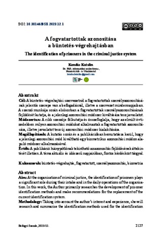 Kondás, Katalin (2023) A fogvatartottak azonosítása a büntetés-végrehajtásban. BELÜGYI SZEMLE / ACADEMIC JOURNAL OF INTERNAL AFFAIRS: A BELÜGYMINISZTÉRIUM SZAKMAI TUDOMÁNYOS FOLYÓIRATA (2010-), 71 (12). pp. 2127-2143. ISSN 2062-9494