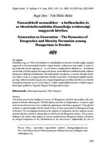 Írásunkban egy, az 1956-os forradalom és szabadságharcot követően Svédországba emigrált magyarok és leszármazottjaik körében végzett kutatás eredményeit ismertetjük. A nyolc félig-strukturált interjú segítségével – az oral history megközelítését alkalmazva – betekintést nyerhetünk a Svédországban élő magyarok három nemzedékének családtörténetébe, különös tekintettel a többségi társadalomba való beilleszkedés témakörére, a nemzeti identitás kérdésére, illetve a helyi és a magyar kultúrához fűződő viszonyukra. A tanulmány legfőbb tanulsága, hogy változó formában ugyan, ám a magyarságtudat generációkon átívelően az érintettek önmeghatározásának szerves részét képezi, s ebben megkérdőjelezhetetlen a lokális magyar közösségek, például az Uppsalai Magyar Svéd Egyesület szerepe. | This article presents the findings of a survey of Hungarians and their descendants who emigrated to Sweden following the 1956 Revolution and War of Independence. A total of eight semi-structured interviews were conducted, applying an oral history approach. Through this method, we gained insights into the family history of three generations of Hungarians living in Sweden. The investigation focused on the subjects of integration into the majority society, national identity, and their relationship to both local and Hungarian culture. The primary finding of the study is that, despite its various manifestations, Hungarian identity constitutes an integral component of the self-definition of the interviewees. Additionally, the role of local Hungarian communities (e.g., the Hungarian Swedish Association of Uppsala) is undeniable in this regard.