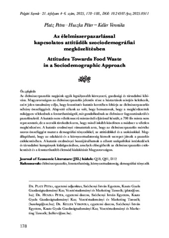 Az élelmiszerpazarlás napjaink egyik legsúlyosabb környezeti, gazdasági és társadalmi kihívása. Magyarországon az élelmiszerpazarlás jelentős része a háztartások szintjén keletkezik, ezért jelen tanulmány célja, hogy kvantitatív kutatás keretében feltárja az élelmiszerpazarlás néhány összefüggését. Alapvető célunk az volt, hogy bemutassuk, hogy a megkérdezettek miképpen vélekednek a fentarthatóságról, mit gondolkodnak az élelmiszer fogyasztásukról és pazarlásukról. A kutatás nem véletlenszerű mintavételi eljárással készült, a 798 fős minta nem reprezentatív, de a szerzők törekedtek arra, hogy minél inkább közelítsen a módszer a véletlen megkérdezésre. A kutatás eredményei rámutattak arra, hogy az élelmiszerpazarlás mértéke szoros összefüggést mutat a demográfiai tényezőkkel, az attitűdökkel és a szokásokkal. Megállapítható, hogy az edukáció és a környezettudatosság kiemelt szerepet játszik a pazarlás csökkentésében. A kutatás eredményei hozzájárulhatnak a célzott szakpolitikai intézkedések és társadalmi kampányok kidolgozásához, amelyek elősegíthetik az élelmiszerpazarlás csökkentését és a fenntarthatóbb életmód kialakítását Magyarországon. | Hungary faces significant challenges related to food waste, which is a pressing environmental, economic, and social issue. In Hungary, a substantial portion of food waste is generated by households, prompting the investigation into its correlates using quantitative research methods. The primary objective of this study was to examine how respondents perceived the sustainability of their food consumption and waste. The survey’s non-probability sampling method precludes the use of a random sample; however, the authors have sought to employ a method approximating randomness as closely as possible. The results of the research indicated a strong correlation between the extent of food waste and demographic factors, attitudes, and habits. The findings suggest that education and environmental awareness play a pivotal role in reducing waste. The findings of this study can inform the formulation of targeted policy measures and social campaigns that aim to reduce food waste and promote more sustainable lifestyles in Hungary.