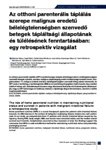 Az otthoni parenterális táplálás (OPT) kulcsfontosságú terápiás lehetőséget jelent a bélelégtelenségben szenvedő betegek számára, azonban malignus alapbetegség esetén hatékonysága kevésbé ismert. Vizsgálatunkban 17, malignus eredetű krónikus bélelégtelenségben szenvedő beteg adatait elemeztük. Az OPT során a testtömeg, a testtömegindex (BMI) és az izomtömeg lényegében stabil maradt, míg a medián túlélés 9 hónap volt. Szövődmények összesen négy alkalommal fordultak elő. Eredményeink alátámasztják, hogy az OPT biztonságos és hatékony módszer a tápláltsági állapot fenntartására, valamint a túlélés meghosszabbítására. | Home parenteral nutrition (HPN) is a crucial therapeutic option for patients with intestinal failure; however, its effectiveness in the context of malignant underlying disease remains less well understood. In our study, we analyzed data from 17 patients with chronic intestinal failure caused by malignancy. During HPN, body weight, BMI, and muscle mass remained stable, and the median overall survival was 9 months. Complications occurred on four occasions in total. Our findings support the conclusion that HPN is a safe and effective method for maintaining nutritional status and potentially prolonging survival.