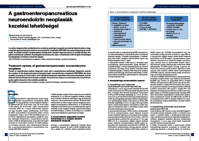 A modern diagnosztikai eszközöknek és a részletes patológiai vizsgálati arzenálnak köszönhetően a diagnosztizált gastroenteropancreaticus neuroendokrin neoplasiák (GEP-NEN-ek) száma folyamatosan emelkedik. Az utóbbi években részletesebben kidolgozták a kezelési algoritmusokat, és további klinikai vizsgálati eredmények születtek. Összefoglaló tanulmányunk célja a rendelkezésre álló terápiás lehetőségek összefoglalása a hatályos irányelvek alapján. | Thanks to sophisticated modern diagnostic tools and a comprehensive pathologic diagnostic arsenal, the number of the diagnosed gastroenteropancreatic neuroendocrine neoplasms (GEP-NENs) has been steadily increasing. In recent years, more detailed therapeutic algorithms have been developed, and additional clinical trial data have become available. The aim of our review is to summarize the current therapeutic options based on the available guidelines.