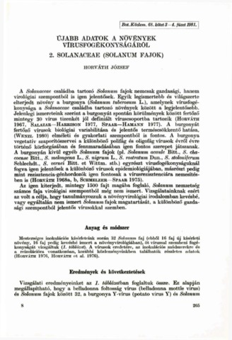 Horváth, József (1981) Újabb adatok a növények vírusfogékonyságáról 2. Solanaceae (Solanum fajok) = New data on the Virus Susceptibility of Plants 2. Solanaceae (Solanum species). BOTANIKAI KÖZLEMÉNYEK, 68 (3-4). pp. 265-271. ISSN 0006-8144