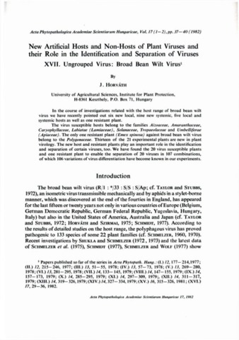 Horváth, József (1982) New Artificial Hosts and Non-hosts of Plant Viruses And their Role in the Identification and Separation of Viruses. 17. Ungrouped Virus: Broad Bean Wilt Virus. ACTA PHYTOPATHOLOGICA ACADEMIAE SCIENTIARUM HUNGARICAE, 17 (1-2). pp. 37-40. ISSN 0001-6780