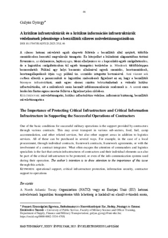 Gulyás, György (2025) A kritikus infrastruktúrák és a kritikus információs infrastruktúrák védelmének jelentősége a beszállítók sikeres művelettámogatásában. HADTUDOMÁNY: A MAGYAR HADTUDOMÁNYI TÁRSASÁG FOLYÓIRATA, 35 (E). pp. 46-62. ISSN 1215-4121