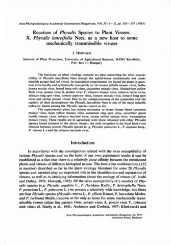 Horváth, József (1985) Reaction of Physalis Species to Plant Viruses. X. Physalis lanceifolia Nees, as a new host to some mechanically transmissible viruses. ACTA PHYTOPATHOLOGICA ACADEMIAE SCIENTIARUM HUNGARICAE, 20 (1-2). pp. 103-107. ISSN 0001-6780