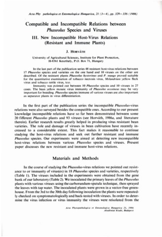 Horváth, József (1986) Compatible and Incompatible Relations between Phaseolus Species and Viruses III. New Incompatible Host-Virus Relations (Resistant and Immune Plants). ACTA PHYTOPATHOLOGICA ET ENTOMOLOGICA HUNGARICA, 21 (3-4). pp. 329-336. ISSN 0238-1249