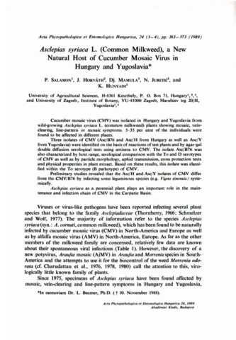 Salamon, P and Horváth, József and Mamula, D and Juretic, N and Hunyadi, K (1989) Asclepias-syriaca-L (Common Milkweed), A New Natural Host of Cucumber Mosaic Virus in Hungary and Yugoslavia. ACTA PHYTOPATHOLOGICA ET ENTOMOLOGICA HUNGARICA, 24 (3-4). pp. 363-373. ISSN 0238-1249