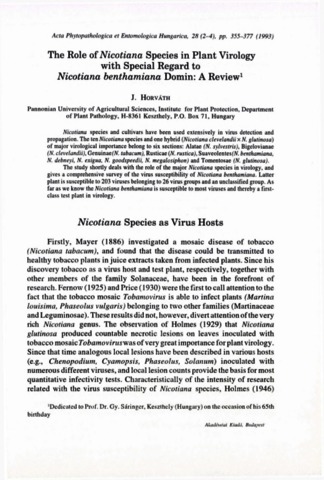 Horváth, József (1993) The Role of Nicotiana Species in Plant Virology with Special Regard to Nicotiana benthamiana Domin: A Review. ACTA PHYTOPATHOLOGICA ET ENTOMOLOGICA HUNGARICA, 28 (2-4). pp. 355-377. ISSN 0238-1249
