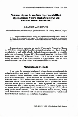 Kazinczi, Gabriella and Horváth, József (1998) Solanum nigrum L. as a New Experimental Host of Melandrium Yellow Fleck Bromovirus and Sowbane Mosaic Sobemovirus. ACTA PHYTOPATHOLOGICA ET ENTOMOLOGICA HUNGARICA, 33 (1-2). pp. 27-30. ISSN 0238-1249