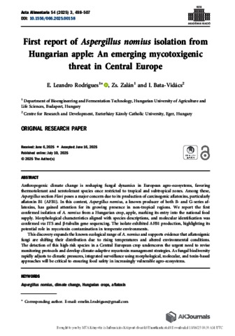 Leandro Rodrigues, Emelin and Zalán, Zsolt and Batáné Vidács, Ildikó (2025) First report of Aspergillus nomius isolation from Hungarian apple: An emerging mycotoxigenic threat in Central Europe. ACTA ALIMENTARIA: AN INTERNATIONAL JOURNAL OF FOOD SCIENCE, 54 (3). pp. 498-507. ISSN 0139-3006