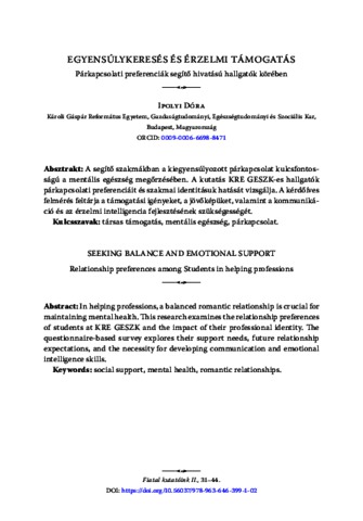A segítő szakmákban a kiegyensúlyozott párkapcsolat kulcsfontosságú a mentális egészség megőrzésében. A kutatás KRE GESZK-es hallgatók párkapcsolati preferenciáit és szakmai identitásuk hatását vizsgálja. A kérdőíves felmérés feltárja a támogatási igényeket, a jövőképüket, valamint a kommunikáció és az érzelmi intelligencia fejlesztésének szükségességét. | In helping professions, a balanced romantic relationship is crucial for maintaining mental health. This research examines the relationship preferences of students at KRE GESZK and the impact of their professional identity. The questionnaire-based survey explores their support needs, future relationship expectations, and the necessity for developing communication and emotional intelligence skills.
