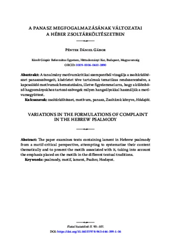 Péntek, Dániel Gábor (2025) A panasz megfogalmazásának változatai a héber zsoltárköltészetben = Variations in the formulations of complaint in the Hebrew psalmody. In: Fiatal kutatóink II. : Az Egyetemi Kutatói Ösztöndíj Program a Károlin, 2024/2025. Károli könyvek. Tanulmánykötet . L’Harmattan Kiadó, Károli Gáspár Református Egyetem, Budapest, pp. 93-107. ISBN 978-963-646-399-1, 978-963-646-229-1