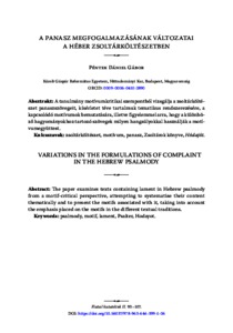 A tanulmány motívumkritikai szempontból vizsgálja a zsoltárköltészet panaszszövegeit, kísérletet téve tartalmuk tematikus rendszerezésére, a kapcsolódó motívumok bemutatására, illetve figyelemmel arra, hogy a különböző hagyományokhoz tartozó szövegek milyen hangsúlyokkal használják a motívumegyüttest. | The paper examines texts containing lament in Hebrew psalmody from a motif-critical perspective, attempting to systematise their content thematically and to present the motifs associated with it, taking into account the emphasis placed on the motifs in the different textual traditions.