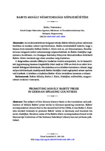 Az irodalomtörténeti dolgozat témája Babits Mihály prózai műveinek fordítása és kiadása német nyelvterületen. Babits levelezéséből kiderül, hogy a húszas évek második felében Stefan I. Klein volt az, aki folyamatosan, fáradhatatlanul dolgozik művei németországi népszerűsítésén és Babits Halálfiai regényének a fordításán. Az Országos Széchényi Könyvtár Kézirattárában fellelhető Babits–Klein-levelezés egy része azonban még kiadatlan. A dolgozatban szintén többnyire kiadatlan levelek szerepelnek. Az itt összeállított jegyzetanyag hasznos kiegészítője lehet majd az 1930-as évek és az utáni levelezését feldolgozó köteteknek. Munkámban arra a kérdésre kerestem a választ, hogy milyen körülmények akadályozták Babits Halálfiai című regényének német nyelven való kiadását. A kérdésre a kiadatlan Babits–Klein-levelekben kerestem a választ. | The subject of this literary history thesis is the translation and publication of Mihály Babits’ prose works in German-speaking countries. Babits’ correspondence reveals that in the second half of the 1920s, it was Stefan I. Klein who worked tirelessly to promote Babits’ works in Germany and translate his novel, Halálfiai. However, some of the Babits-Klein correspondence found in the Manuscript Collection of the National Széchényi Library has not yet been published.The thesis also includes mostly unpublished letters. The notes compiled here will be a useful supplement to the volumes processing his correspondence from the 1930s and beyond. In my work, I sought to answer the question of what circumstances prevented the publication of Babits’ novel Halálfiai in German. In my thesis my aim is to find the answer to this question in the unpublished Babits-Klein letters.