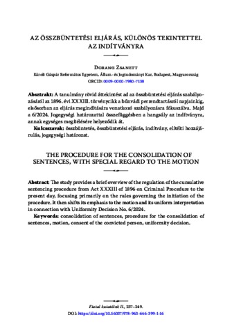 A tanulmány rövid áttekintést ad az összbüntetési eljárás szabályozásáról az 1896. évi XXXIII. törvénycikk a bűnvádi perrendtartásról napjainkig, elsősorban az eljárás megindítására vonatkozó szabályozásra fókuszálva. Majd a 6/2024. Jogegységi határozattal összefüggésben a hangsúly az indítványra, annak egységes megítélésére helyeződik át. | The study provides a brief overview of the regulation of the cumulative sentencing procedure from Act XXXIII of 1896 on Criminal Procedure to the present day, focusing primarily on the rules governing the initiation of the procedure. It then shifts its emphasis to the motion and its uniform interpretation in connection with Uniformity Decision No. 6/2024.