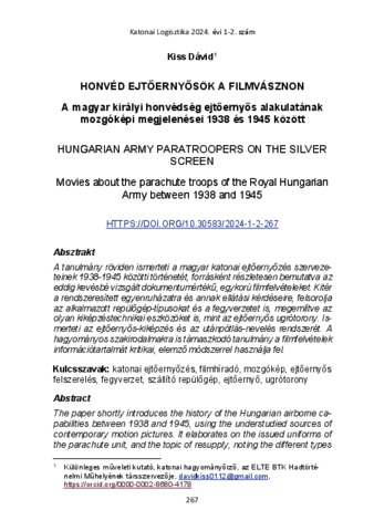 Kiss, Dávid (2024) Honvéd ejtőernyősök a filmvásznon : A magyar királyi honvédség ejtőernyős alakulatának mozgóképi megjelenései 1938 és 1945 között. KATONAI LOGISZTIKA, 32 (1-2). pp. 267-296. ISSN 1588-4228