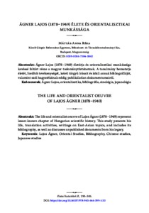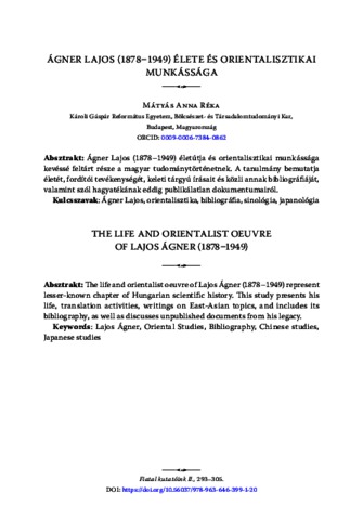 Ágner Lajos (1878–1949) életútja és orientalisztikai munkássága kevéssé feltárt része a magyar tudománytörténetnek. A tanulmány bemutatja életét, fordítói tevékenységét, keleti tárgyú írásait és közli annak bibliográfiáját, valamint szól hagyatékának eddig publikálatlan dokumentumairól. | The life and orientalist oeuvre of Lajos Ágner (1878–1949) represent lesser-known chapter of Hungarian scientific history. This study presents his life, translation activities, writings on East-Asian topics, and includes its bibliography, as well as discusses unpublished documents from his legacy.
