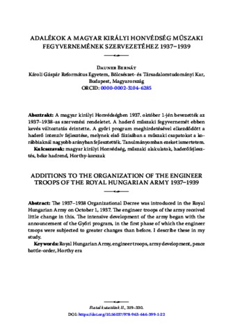 A magyar királyi Honvédségben 1937. október 1-jén bevezették az 1937–1938-as szervezési rendeletet. A haderő műszaki fegyvernemét ebben kevés változtatás érintette. A győri program meghirdetésével elkezdődött a haderő intenzív fejlesztése, melynek első fázisában a műszaki csapatokat a korábbiaknál nagyobb arányban fejlesztették. Tanulmányomban ezeket ismertetem. | The 1937–1938 Organizational Decree was introduced in the Royal Hungarian Army on October 1, 1937. The engineer troops of the army received little change in this. The intensive development of the army began with the announcement of the Győri program, in the first phase of which the engineer troops were subjected to greater changes than before. I describe these in my study.