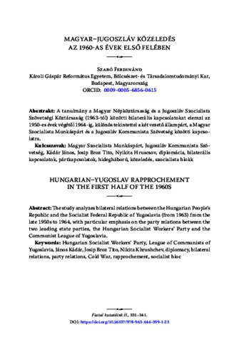 A tanulmány a Magyar Népköztársaság és a Jugoszláv Szocialista Szövetségi Köztársaság (1963-tól) közötti bilaterális kapcsolatokat elemzi az 1950-es évek végétől 1964-ig, különös tekintettel a két vezető állampárt, a Magyar Szocialista Munkáspárt és a Jugoszláv Kommunista Szövetség közötti kapcsolatra. | The study analyzes bilateral relations between the Hungarian People’s Republic and the Socialist Federal Republic of Yugoslavia (from 1963) from the late 1950s to 1964, with particular emphasis on the party relations between the two leading state parties, the Hungarian Socialist Workers’ Party and the Communist League of Yugoslavia.