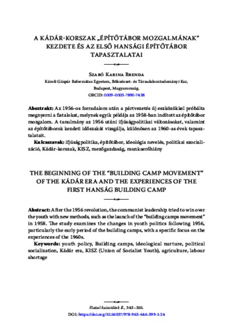 Az 1956-os forradalom után a pártvezetés új eszközökkel próbálta megnyerni a fiatalokat, melynek egyik példája az 1958-ban indított az építőtábor mozgalom. A tanulmány az 1956 utáni ifjúságpolitikai változásokat, valamint az építőtáborok kezdeti időszakát vizsgálja, különösen az 1960-as évek tapasztalatait. | After the 1956 revolution, the communist leadership tried to win over the youth with new methods, such as the launch of the “building camps movement” in 1958. The study examines the changes in youth politics following 1956, particularly the early period of the building camps, with a specific focus on the experiences of the 1960s.