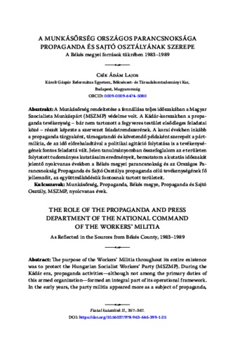 A Munkásőrség rendeltetése a fennállása teljes időszakában a Magyar Szocialista Munkáspárt (MSZMP) védelme volt. A Kádár-korszakban a propaganda tevékenység – bár nem tartozott a fegyveres testület elsődleges feladatai közé – részét képezte a szervezet feladatrendszerének. A korai években inkább a propaganda tárgyaként, támogatandó és követendő példaként szerepelt a pártmilícia, de az idő előrehaladtával a politikai agitáció folytatása is a tevékenységének fontos feladattá vált. Jelen tanulmányomban összefoglalom az e területen folytatott tudományos kutatásaim eredményeit, bemutatom a kutatás időszakát jelentő nyolcvanas években a Békés megyei parancsnokság és az Országos Parancsnokság Propaganda és Sajtó Osztálya propaganda célú tevékenységének fő jellemzőit, az együttműködésük fontosnak tartott területeit. | The purpose of the Workers’ Militia throughout its entire existence was to protect the Hungarian Socialist Workers’ Party (MSZMP). During the Kádár era, propaganda activities—although not among the primary duties of this armed organization—formed an integral part of its operational framework. In the early years, the party militia appeared more as a subject of propaganda, serving as a model to support and follow. However, over time, the continuation of political agitation also became an important aspect of its activities. In this study, I summarize the results of my scientific research conducted in this field and present the main characteristics of the propaganda-related activities of the Békés County Command and the Propaganda and Press Department of the National Command during the 1980s, which is the period covered by my research. I also highlight the areas of cooperation they considered important.