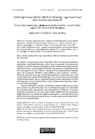 Az egyetemi közösségi szerepvállalás (EKSZ) koncepciójának gyakorlati megvalósítása annak egyik lehetséges eszköze, hogy az egyetemek is hozzájáruljanak napjaink társadalmi és környezeti értelemben egyaránt fenntarthatatlan folyamatainak megváltoztatásához. Az EKSZ egyik fő vélt előnye az egyetemek és partnereik közötti hatásos tudásmegosztás és közös cselekvés a környezeti és társadalmi problémák megoldásához való hozzájárulás érdekében. Ennek ellenére az EKSZ gyakorlata, valamint a különböző társadalmi, gazdasági szereplők együttműködése és tudásmegosztása szempontjából kulcsfontosságúnak tekintett földrajzi és kapcsolati közelség viszonyáról eddig nem készült tudományos kutatás. E helyzetből kiindulva kutatásunk kérdései a következők: Milyen hatással van a közelség (hiánya) az EKSZ-i folyamatokra? Hogyan hat az EKSZ a résztvevők közti közelségre? E kutatási kérdésekre a vonatkozó szakirodalmi áttekintés mellett egy hazai empirikus, kvalitatív vizsgálattal kerestük a választ. Eredményeink alapján arra a következtetésre jutottunk, hogy az egyetemi közösségi szerepvállalásban a földrajzi és a kapcsolati közelség formái egymással szoros kapcsolatban állnak. Emellett több olyan intézményi jellegű folyamatot azonosíthattunk, amelyek az egyetemek és a potenciális EKSZ-partnerek közti távolság növelésének irányába hatnak, s ez újabb magyarázattal szolgál az EKSZ alacsony (hazai) elterjedtségére. | The concept of university community engagement (UCE) is about universities engaging with non-university actors in a way that is mutually beneWcial, albeit in diXerent ways, and that enriches the core activities of universities. UCE is closely related to the concept of the third mission, but also substantially diXerent. On the one hand, both concepts (sets of activities) emphasisethecooperation of university actors with actors outsidethe university. However, while the dominant understanding of thethird mission is clearly focused on business-likerelationships, UCE focuses explicitly on socially disadvantaged, excluded, resource-poor groups, with an emphasis on promoting social justice and environmental sustainability issues. So far, however, there is relatively little research on the actual role of UCE in the sustainability transition in theliterature(or on its social impact in general), and thereis a virtual absence of studies on the territorial aspects of UCE and university social responsibility (USR) in the broader sense. Hungarian research on the aboveconcepts (sets of activities) mainly deals with the concept of USR with a focus on the content of university strategic documents and on university communication through university homepages and online press. Furthermore, although both local and global scalelinkages areincluded in thetheoretical framework of UCE, the actual mechanisms of their operation in the context of geographical and relational proximity have not been explored, despitethe key rolethat both types of proximity play in knowledgesharing, fostering innovation and building collaborations between universities and their partners. In our study, we draw on this research gap to explore the relationship between UCE and proximity. The research questions we aim to tackle are: What is the impact of (lack of) proximity on UCE processes? How does UCE aXect proximity between participants? In order to empirically examine our research questions, we usetheresults of our qualitative research based on semi-structured in-depth individual interviews. We conclude that there is a close relationship between geographical and other forms of proximity in the context of UCE, and that several institutional processes can be identiWed that work towards increasing the distance between universities and potential UCE partners. All this provides another explanation for the low (Hungarian) uptake of UCE.
