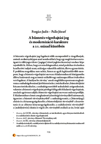 Forgács, Judit and Pallo, József (2024) A büntetés-végrehajtási jog és modernizáció karaktere a 21. század küszöbén. In: „Mindennek a lélek a rendje…”. Ludovika Egyetemi Kiadó, Budapest, pp. 155-164. ISBN 9789636531331