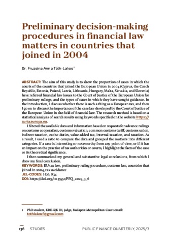 Tóth-Lakos, Fruzsina Anna (2025) Preliminary decision-making procedures in financial law matters in countries that joined in 2004. PÉNZÜGYI SZEMLE/PUBLIC FINANCE QUARTERLY (1963-), 71 (3). pp. 136-159. ISSN 0031-496X