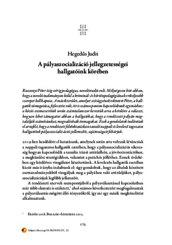 Hegedűs, Judit (2024) A pályaszocializáció jellegzetességei hallgatóink körében. In: „Mindennek a lélek a rendje…”. Ludovika Egyetemi Kiadó, Budapest, pp. 175-189. ISBN 9789636531331