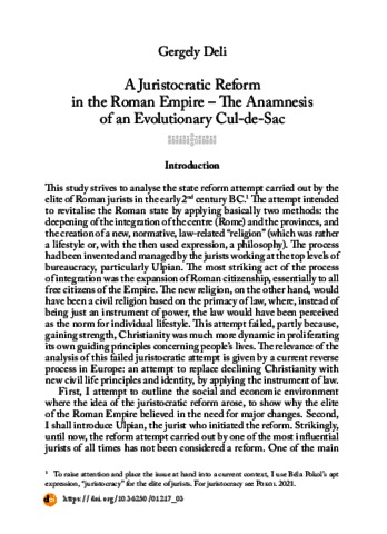 Deli, Gergely (2024) A Juristocratic Reform in the Roman Empire : The Anamnesis of an Evolutionary Cul-de-Sac. In: The Evolution of the European States. Ludovika Egyetemi Kiadó, Budapest, pp. 17-63. ISBN 9789636530723
