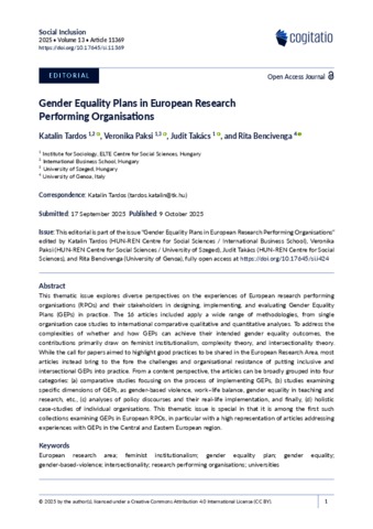 Tardos, Katalin and Paksi, Veronika and Takács, Judit and Bencivenga, Rita (2025) Gender Equality Plans in European Research Performing Organisations. SOCIAL INCLUSION, 13 (x). pp. 1-9. ISSN 2183-2803