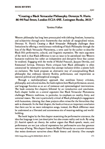 Hafian, Yamina (2024) “Creating a Black Vernacular Philosophy. Devonya N. Havis. 86-90 Paul Street, London EC2A 4NE. Lexington Books, 2023.”. EGER JOURNAL OF AMERICAN STUDIES, 18. pp. 171-173. ISSN 1786-2337