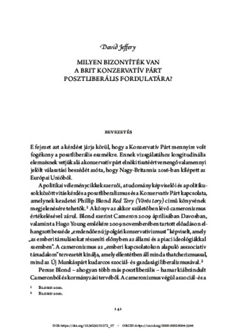 Jeffery, David (2025) Milyen bizonyíték van a brit konzervatív párt posztliberális fordulatára? In: A posztliberális fordulat és a konzervativizmus jövője. Ludovika Egyetemi Kiadó, Budapest, pp. 141-166. ISBN 9789636532253; 9789636532246