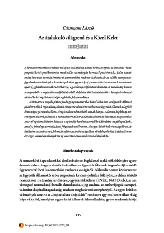 A liberális nemzetközi rendszer válsága és átalakulása a közel-keleti térséget is az amerikai–kínai geopolitikai és geoökonómiai rivalizálás szemüvegén keresztül pozicionálta. Jelen tanulmány Sørensen nyomán értelmezi a nemzetközi rendszer átalakulását az alábbi szempontok figyelembevételével: (1) a hatalmi-politikai egyensúly; (2) nemzetközi szervezetek és intézmények; (3) globális normák és értékek; (4) a gazdasági erőforrások eloszlása. A tanulmány három szempontból – a regionális rend felülnézetből, oldalnézetből és alulnézetből – kívánja értelmezni a közel-keleti régió érintettségét a globális folyamatokban. Az írás arra a megállapításra jut, hogy a posztamerikai Közel-Kelet nem az Egyesült Államok jelenléte nélküli régió, Kína jelentős térnyerése ellenére továbbra is az Egyesült Államok a legfőbb biztonságot garantáló állam. A regionális rendet inkább annak hiánya, valamint képlékeny szövetségi rendszerek jellemzik, a nemzetközi rendszer átalakulásából eredő bizonytalanság azonban 2020-tól együttműködésre késztette a regionális hatalmi szereplőket (Ábrahám-megállapodások), amely a jelenlegi normalizációs folyamatban ölt testet. Az egyes közel-keleti országokban, de különösen az arab tavasz folyományaként az arab országokban elindult politikai átalakulás nem ért véget, annak eredményeként új autoritariánus rendszerek alakultak ki.