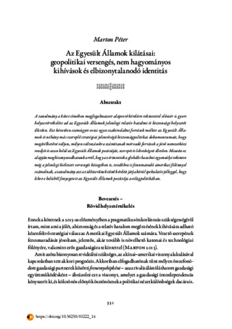 Marton, Péter (2025) Az Egyesült Államok kilátásai: geopolitikai versengés, nem hagyományos kihívások és elbizonytalanodó identitás. In: Átalakuló világrend – Az unipoláris pillanat vége? Ludovika Egyetemi Kiadó, Budapest, pp. 331-348. ISBN 9789636530860