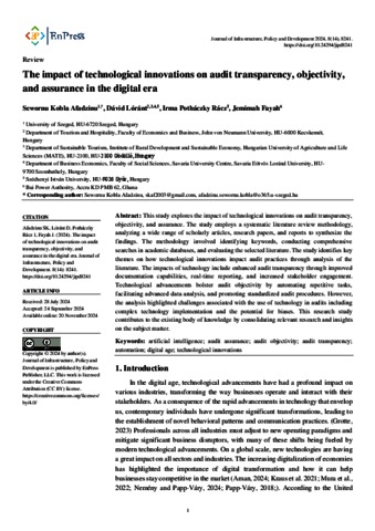 Afadzinu, Sewornu Kobla and Dávid, Lóránt Dénes and Potháczky Rácz, Irma and Jemimah, Fayah (2024) The impact of technological innovations on audit transparency, objectivity, and assurance in the digital era. JOURNAL OF INFRASTRUCTURE POLICY AND DEVELOPMENT, 8 (14). No. 8241. ISSN 2572-7923