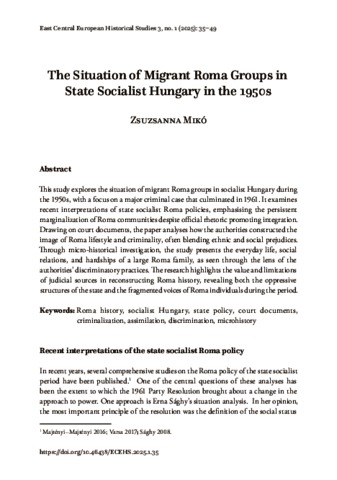 Mikó, Zsuzsanna (2025) The Situation of Migrant Roma Groups in State Socialist Hungary in the 1950s. KELET-KÖZÉP-EURÓPAI TÖRTÉNELMI TANULMÁNYOK, 3 (1). pp. 35-49. ISSN 30040981