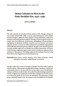 This study examines the evolution of Roma colonies in Pécs, Hungary, during the state socialist period (1950–1990). It situates these developments within broader historical attempts to address the “Roma question” through resettlement, employment initiatives, and forced assimilation policies. Drawing on archival and oral sources, the research traces the establishment, transformation, and liquidation of Roma settlements, highlighting the persistent instability caused by state interventions and internal migration patterns. It reveals how official policies often exacerbated marginalization and contributed to deteriorating living conditions. Through a micro-historical approach, the study provides insight into the everyday lives of Roma communities, the nature of their housing, employment opportunities, and the contradictory responses of local authorities to their presence. The findings underscore the challenges of reconstructing Roma history from fragmentary and often biased sources.
