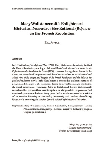 Antal, Éva (2025) Mary Wollstonecraft’s Enlightened Historical Narrative: Her Rational (Re)view on the French Revolution. KELET-KÖZÉP-EURÓPAI TÖRTÉNELMI TANULMÁNYOK, 3 (1). pp. 93-113. ISSN 30040981