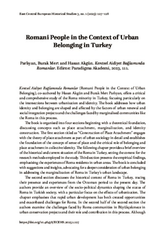 Şimşek, Afide Cansu (2025) Romani People in the Context of Urban Belonging in Turkey : Parlıyan, Burak Mert and Hasan Akgün. Kentsel Aidiyet Bağlamında Romanlar. Edirne: Paradigma Akademi, 2023, 111. KELET-KÖZÉP-EURÓPAI TÖRTÉNELMI TANULMÁNYOK, 3 (1). pp. 127-128. ISSN 30040981
