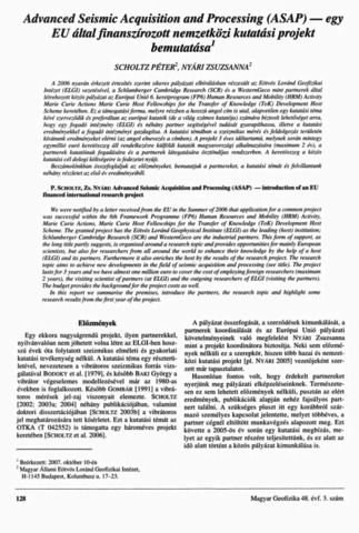 Scholtz, Péter and Nyári, Zsuzsanna (2007) Advanced Seismic Acquisition and Processing (ASAP) - egy EU által finanszírozott nemzetközi kutatási projekt bemutatása. MAGYAR GEOFIZIKA, 48 (3). pp. 128-133. ISSN ISSN 0025-0120