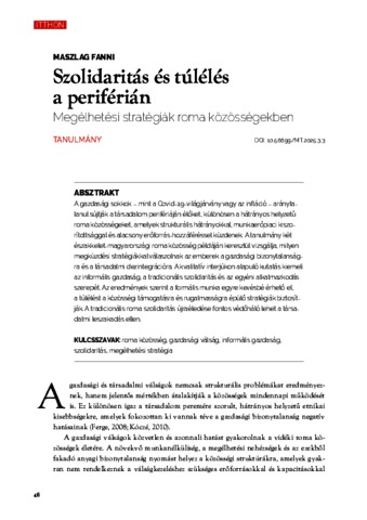A gazdasági sokkok – mint a Covid–19-világjárvány vagy az infláció – aránytalanul sújtják a társadalom perifériáján élőket, különösen a hátrányos helyzetűroma közösségeket, amelyek strukturális hátrányokkal, munkaerőpiaci kiszorítottsággal és alacsony erőforrás-hozzáféréssel küzdenek. A tanulmány kétészakkelet-magyarországi roma közösség példáján keresztül vizsgálja, milyenmegküzdési stratégiákkal válaszolnak az emberek a gazdasági bizonytalanságra és a társadalmi dezintegrációra. A kvalitatív interjúkon alapuló kutatás kiemeliaz informális gazdaság, a tradicionális szolidaritás és az egyéni alkalmazkodásszerepét. Az eredmények szerint a formális munka egyre kevésbé érhető el,a túlélést a közösségi támogatásra és rugalmasságra épülő stratégiák biztosítják. A tradicionális roma szolidaritás újraéledése fontos védőháló lehet a társadalmi leszakadás ellen. | Economic shocks – such as the Covid-19 pandemic or inflation – disproportionately affect marginalized groups, particularly disadvantaged Roma communities, who face structural disadvantages, exclusion from the labor market, and limited access to resources. This study examines the coping strategies developed by people in two Roma communities in northeastern Hungary in response to economic insecurity and social disintegration. Based on qualitative interviews, the research highlights the role of the informal economy, traditional solidarity networks, and individual adaptation. The findings show that formal employment is increasingly inaccessible, and survival depends on strategies rooted in community support and flexibility. The revival of traditional Roma solidarity may provide a vital safety net against deepening social exclusion.