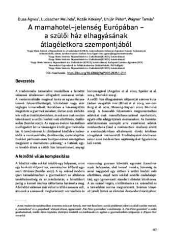 Dusa, Ágnes Réka and Ludescher, Melinda and Kozák, Kökény and Uhljár, Péter and Wágner, Tamás Zoltán (2025) A mamahotel–jelenség Európában – a szülői ház elhagyásának átlagéletkora szempontjából. KAPOCS, 8 (1-2). pp. 157-178. ISSN 1588-7227