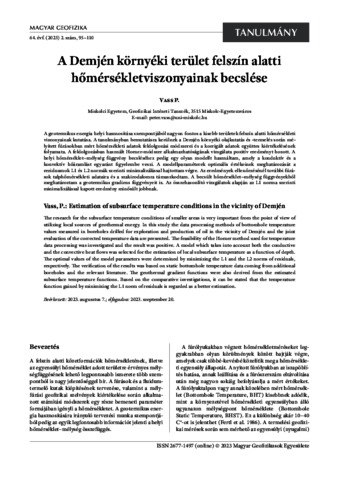 A geotermikus energia helyi hasznosítása szempontjából nagyon fontos a kisebb területek felszín alatti hőmérsékleti viszonyainak kutatása. A tanulmányban bemutatásra kerülnek a Demjén környéki olajkutatás és -termelés során mélyített fúrásokban mért hőmérsékleti adatok feldolgozási módszerei és a korrigált adatok együttes kiértékelésének folyamata. A feldolgozásban használt Horner-módszer alkalmazhatóságának vizsgálata pozitív eredményt hozott. A helyi hőmérséklet–mélység függvény becsléséhez pedig egy olyan modellt használtam, amely a konduktív és a konvektív hőáramlást egyaránt figyelembe veszi. A modellparaméterek optimális értékeinek meghatározását a reziduumok L1 és L2 normák szerinti minimalizálással hajtottam végre. Az eredmények ellenőrzésénél további fúrások talphőmérsékleti adataira és a szakirodalomra támaszkodtam. A becsült hőmérséklet–mélység függvényekből meghatároztam a geotermikus gradiens függvényeit is. Az összehasonlító vizsgálatok alapján az L1 norma szerinti minimalizálással kapott eredmény minősült jobbnak.