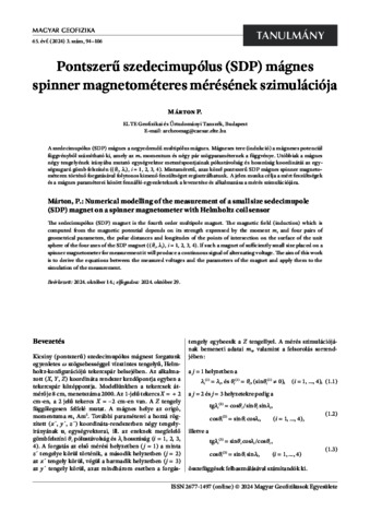 A szedecimupólus (SDP) mágnes a negyedrendű multipólus mágnes. Mágneses tere (indukció) a mágneses potenciál függvényből számítható ki, amely az m4 momentum és négy pár szögparaméternek a függvénye. Utóbbiak a mágnes négy tengelyének irányába mutató egységvektor metszéspontjainak pólustávolság és hosszúság koordinátái az egységsugarú gömb felszínén ((ϑi , λi), i = 1, 2, 3, 4). Mintaméretű, azaz közel pontszerű SDP mágnes spinner magnetométeren történő forgatásával folytonos kimenő feszültséget regisztrálhatunk. A jelen munka célja a mért feszültségek és a mágnes paraméterei között fennálló egyenleteknek a levezetése és alkalmazása a mérés szimulációjára.