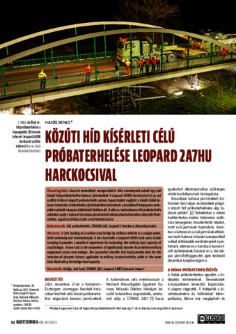 Hazai és nemzetközi szempontból is ritka eseménynek számít egy civil közúti híd próbaterhelése katonai járművekkel. A Leopard 2A7HU harckocsival és az azt szállító trélerrel végzett próbaterhelés számos tapasztalatot nyújtott a közúti hidak katonai teherbírás-értékeléséhez (új feladatként jelentkezik a korábbinál lényegesen nehezebb eszközök mozgása különböző hidakon át). A sikeres, tudományos célú próbaterhelés adatokat nyújt a katonai lánctalpas járműveknél alkalmazható dinamikus tényezők felvételéhez, egyúttal jól illusztrálta a híd teherbírását is. | A test loading of a civilian road bridge by military vehicles is a unique event, both nationally and internationally. A test load with a Leopard 2A7HU tank and a trailer carrying it provides a wealth of experience for evaluating the military load capacity of road bridges. A new task is the movement of significantly heavier-than-before military equipment across river bridges. The successful scientific test load provides data for the inclusion of dynamic factors applicable to military tracked vehicles, while at the same time illustrating the bridge load capacity.