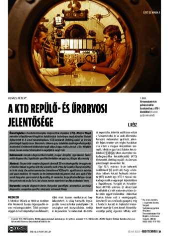 A hordozható komplex diagnosztikai készüléket (KTD) a Medicor Művek mérnökei a Repülőorvosi Vizsgáló és Kutatóintézet tudományos munkatársaival közösen fejlesztették ki. A szerző tanulmányában a KTD történetét, illetőleg repülő- és űrorvosi jelentőségét foglalja össze. Beszámol a titkos magyar űrkutatás részét képező műszerfejlesztésekről. Emlékeinek felidézésével segít abban, hogy a múltat ne csak száraz tényként lássuk, hanem emberi élményként is megéljük és megértsük.| The portable complex diagnostic device (KTD) was developed by the engineers of Medicor Művek together with the scientific staff of the Aeromedical Research Institu-te. In his study, the author summarizes the history of KTD and its significance in aviation and space medicine. He reports on the instrument developments that were part of the secret Hungarian space research. By recalling his memories, his publication helps us to see the past not only as dry facts, but also as human experiences and to understand them.