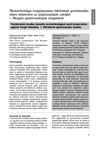 Jelen munkánkban összefoglalást nyújtunk fafelületeken alkalmazható, gombásodás elleni védelmi rendszer kialakítását célzó projektünkrôl. Célunk olyan új, iparban is hasznosítható eljárás(ok) alapjainak megteremtése, amely(ek) során természetes eredetű vegyületeket alkalmazunk a fa anyagának tartósabbá tételére, kiváltva ezzel a nehézfémeken alapuló technológiákat. A fa bizonyos extraktív összetevői, mint a gyantasavak és a fenolszármazékok ismertek rothadást gátló hatásukról. Először pinoszilvin (3,5-dihidroxi-t-sztilbén) és galluszsav (2,3,4-trihidroxi-benzoesav) adszorpcióját tanulmányoztuk. Raman-mikroszkópiai és kvantumkémiai számításokkal alátámasztott DRIFTS (diffúz reflexiós infravörös Fourier transzformációs spektroszkópia) méréseket kombináltunk pásztázó elektronmikroszkópiával (SEM), fajlagosfelületméréssel és a lignintartalom (κ-szám) meghatározásával. Emellett bemutatunk néhány, rezgési spektroszkópiai analízissel, újonnan kapott eredményt is.