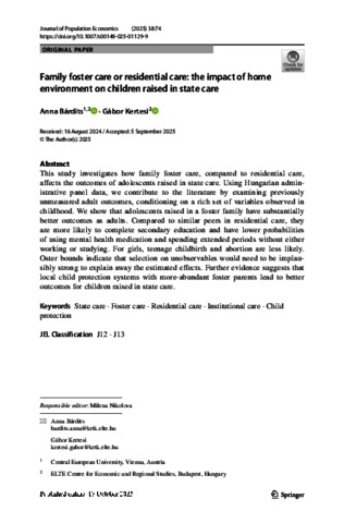 Bárdits, Anna and Kertesi, Gábor (2025) Family foster care or residential care : the impact of home environment on children raised in state care. JOURNAL OF POPULATION ECONOMICS, 38 (4). No. 74. ISSN 0933-1433 (In Press)