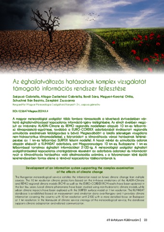 Szépszó, Gabriella and Allaga-Zsebeházi, Gabriella and Bordi, Sára and Megyeri-Korotaj, Otília Anna and Schuchné Bán, Beatrix and Zempléni, Zsuzsanna (2024) Az éghajlatváltozás hatásainak komplex vizsgálatát támogató információs rendszer fejlesztése. LÉGKÖR, 69 (KSZ). pp. 23-29. ISSN 0133-3666
